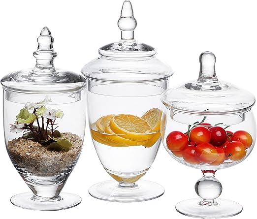 $25 for set of three buy now. Glass apothecary jars are a marvelous way to add panache as a decorative element to your home. Amazing gallery of interior design and decorating ideas of glass apothecary jars in closets, living rooms, bathrooms, laundry/mudrooms, kitchens, entrances/foyers by elite interior designers. Features this contemporary shaped apothecary jar set is a set of three assorted style clear glass jars with lids. Palais glassware clear glass apothecary jars wedding candy buffet containers.